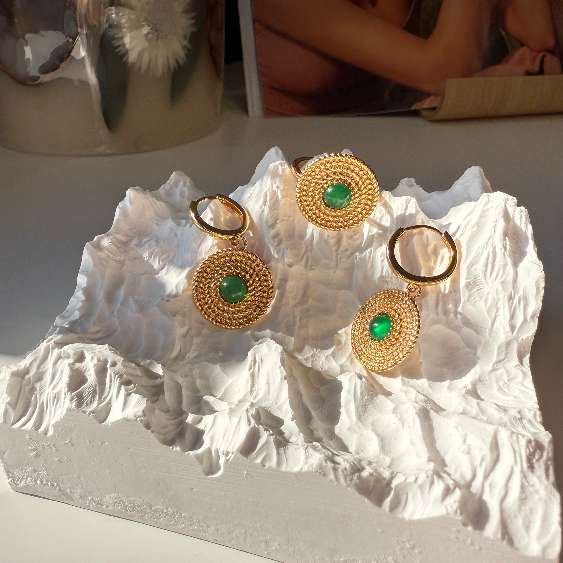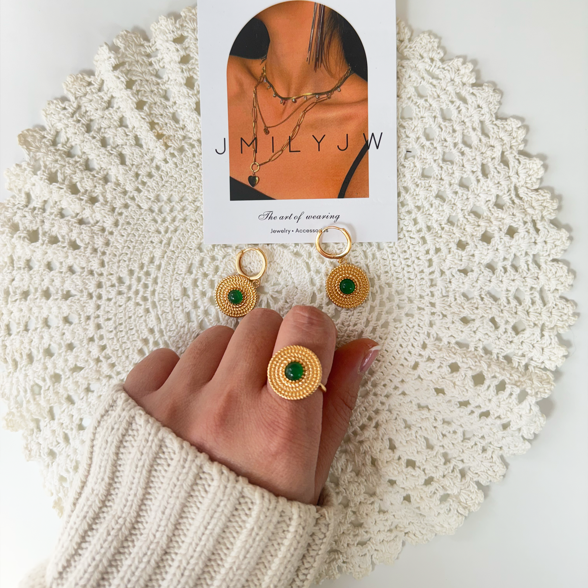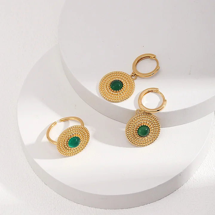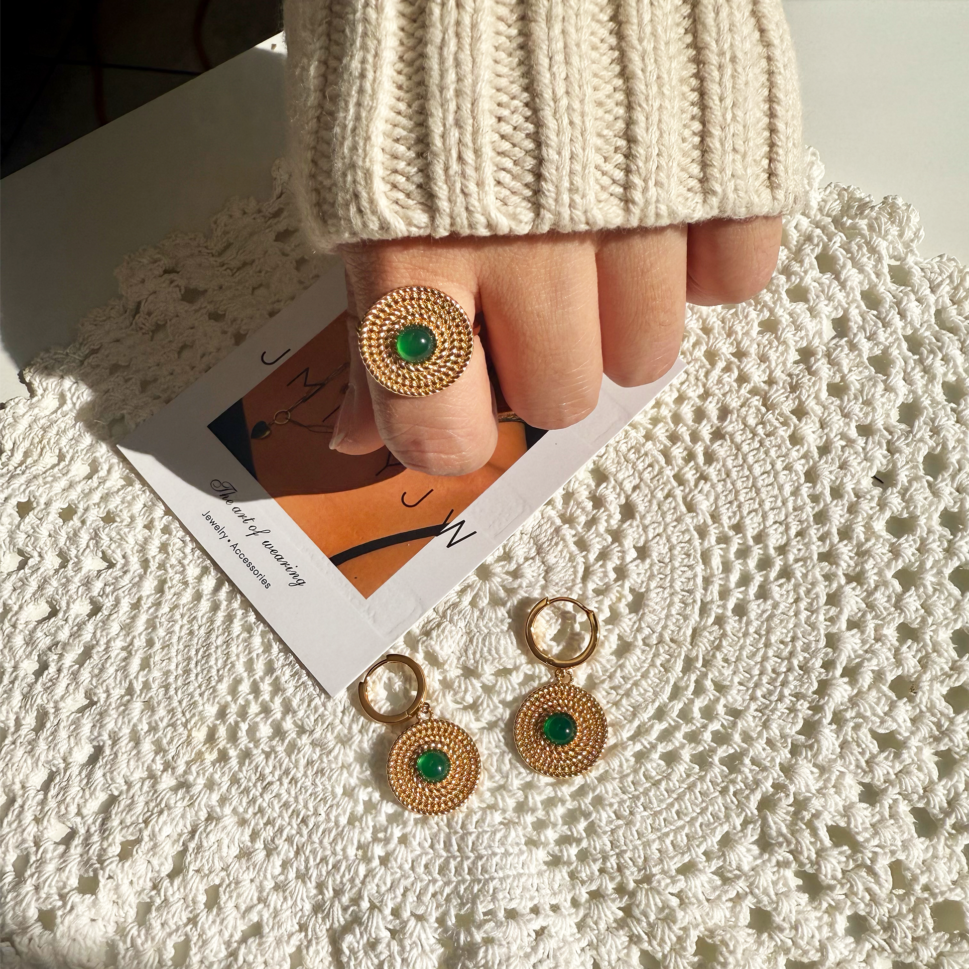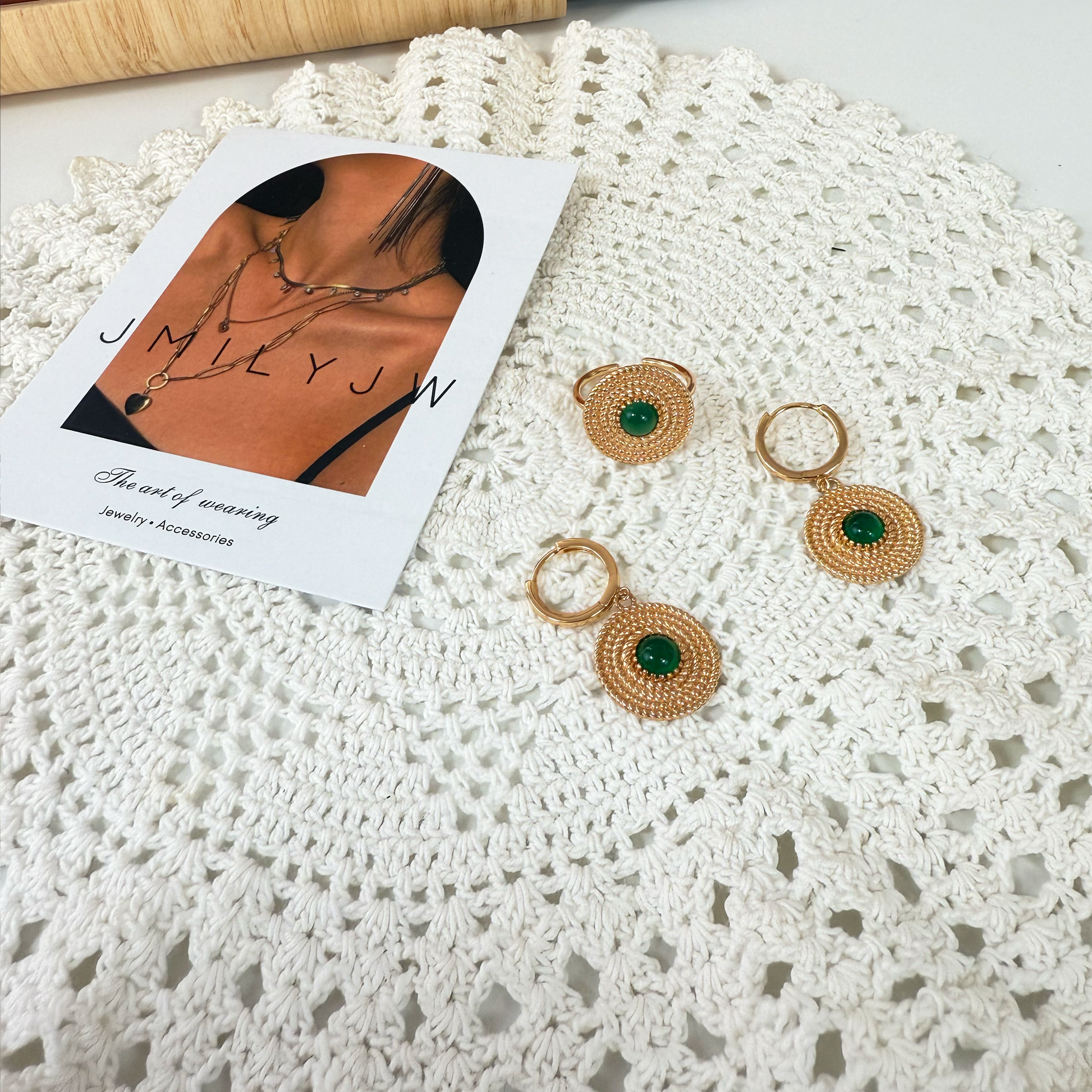 These elegant Vintage Emerald Circle Earrings & Ring add a touch of sophistication to any outfit. Made with genuine emeralds and a vintage design, these accessories exude timeless beauty. Perfect for adding a touch of classic elegance to your style.